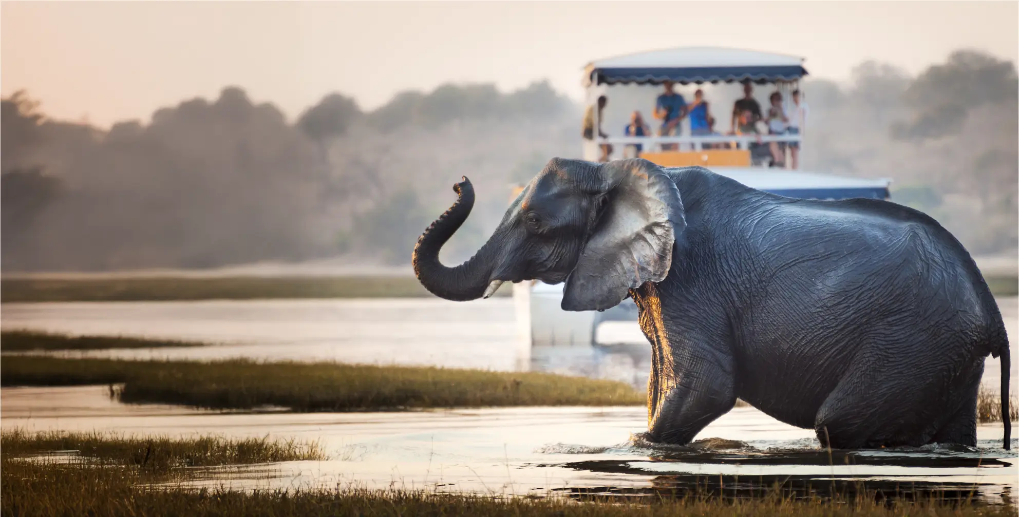 From the water, watch crocodiles lurk, elephants swim and dunk each other playfully, and big cats come to drink.